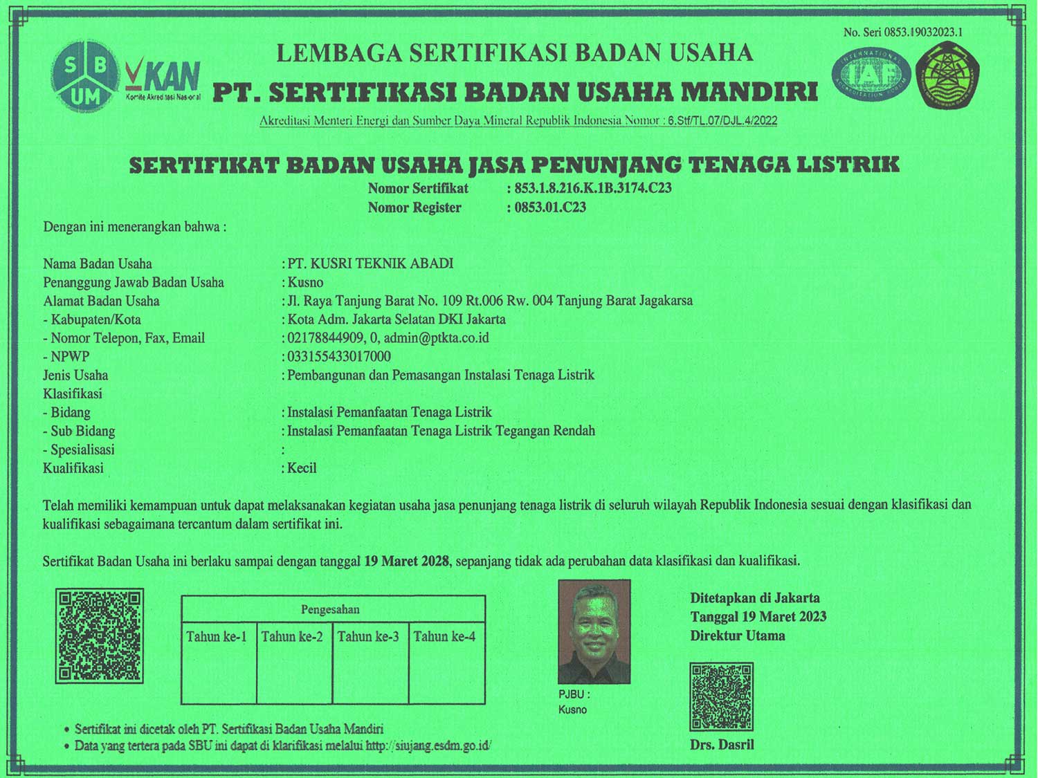 Sertifikat Badan Usaha Jasa Penunjang Tenaga Listrik