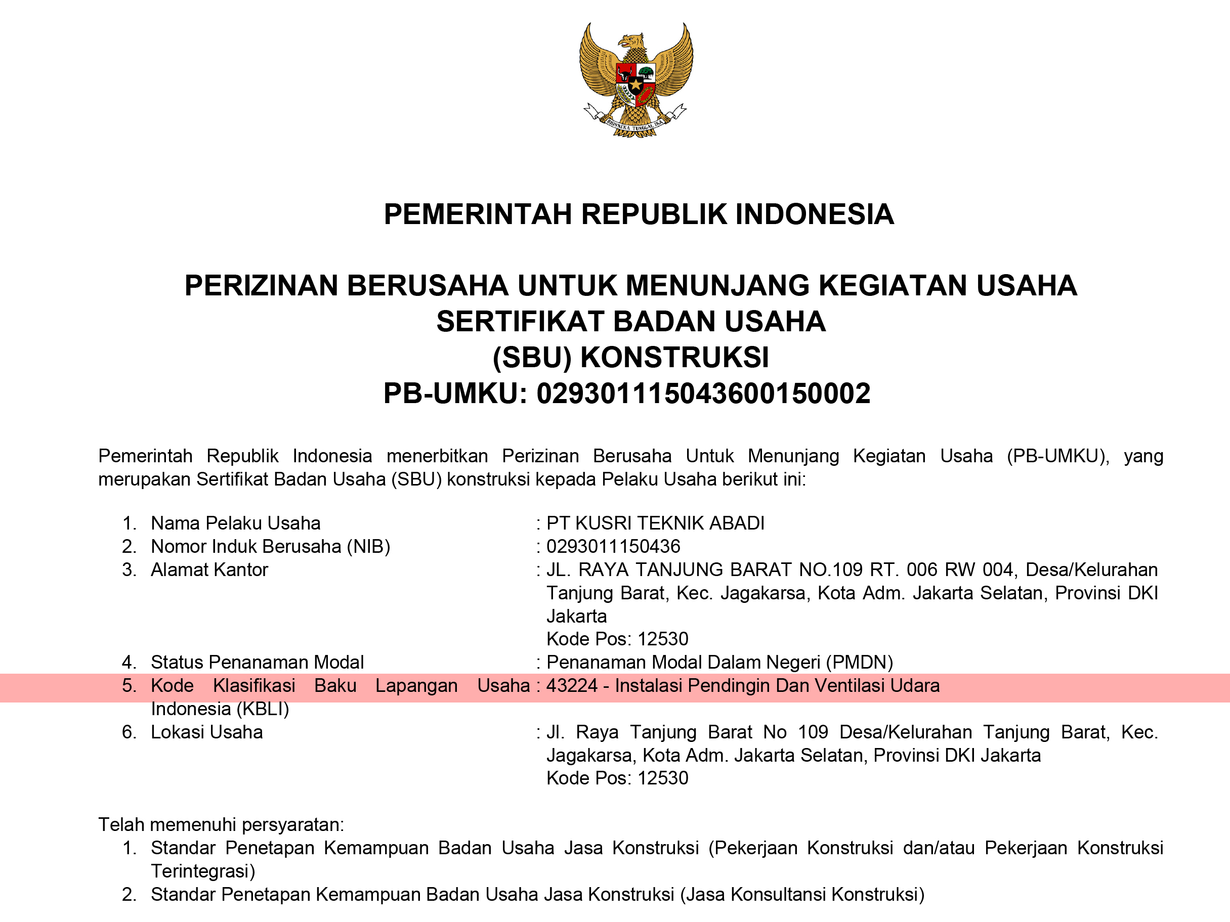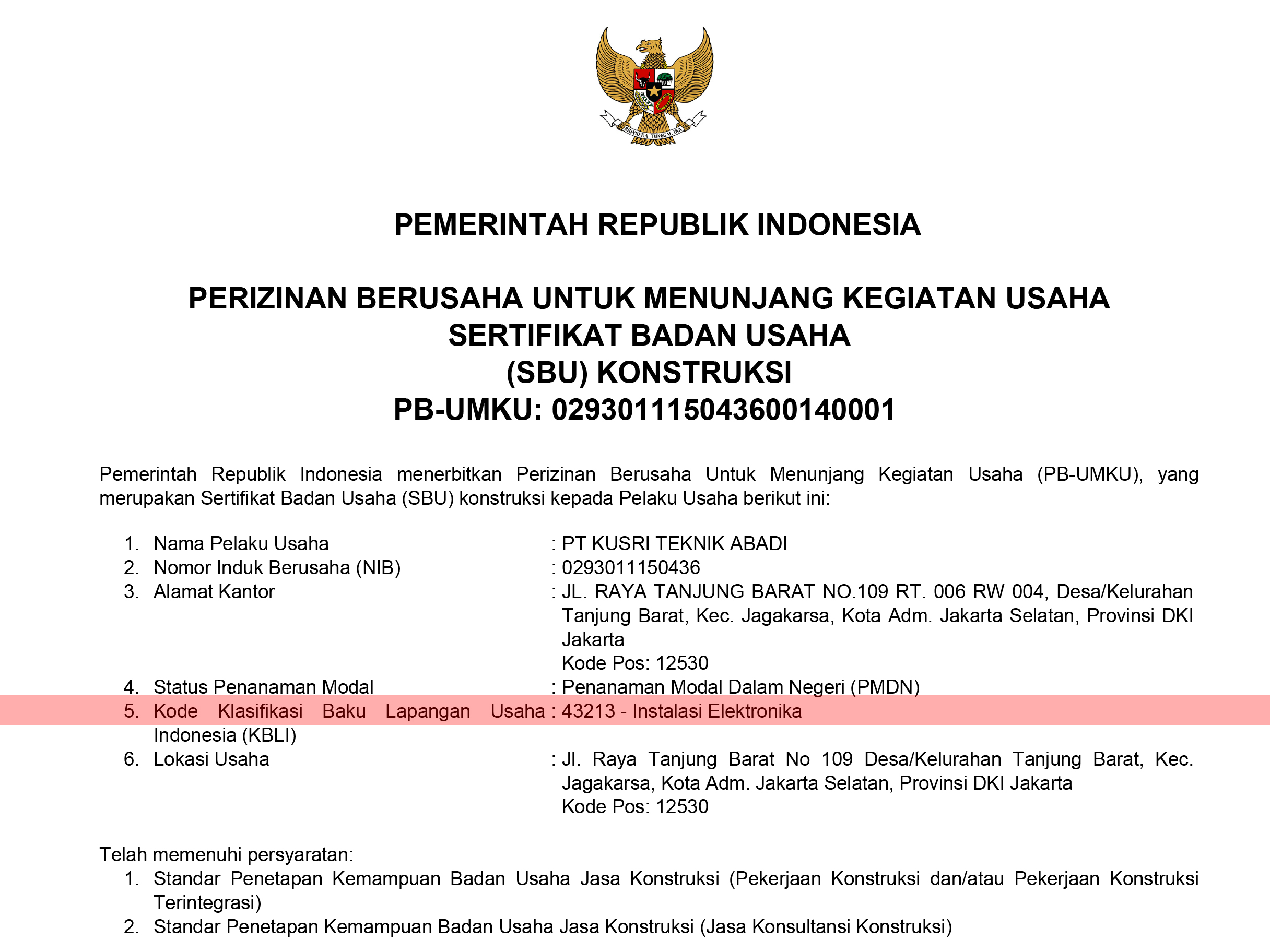 Jenis Usaha : Pembangunan dan pemasangan Instalasi Tenaga Listrik